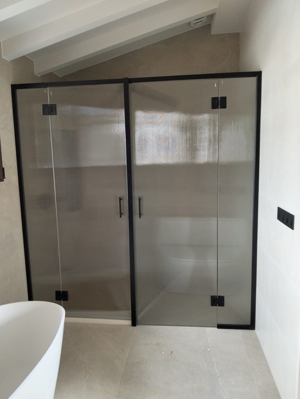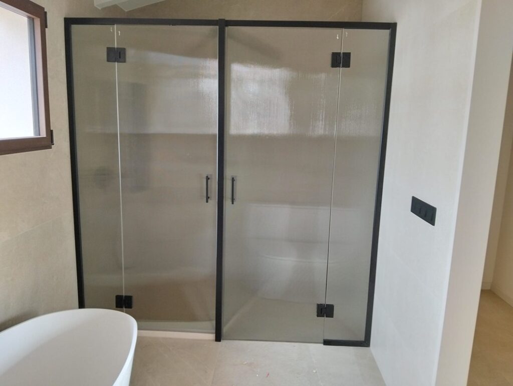 Mamparas de baño o divisorias de vidrio templado. Diseño moderno y resistente a la humedad. Acabado transparente, esmerilado o serigrafiado.